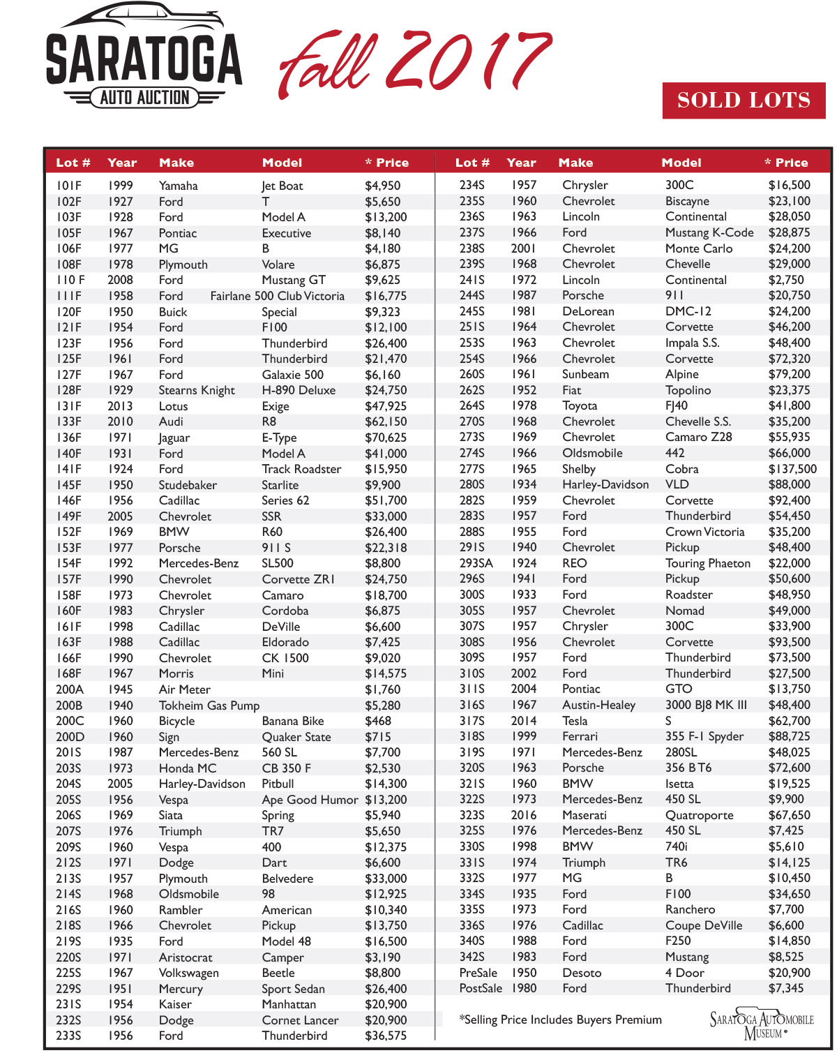 2017 Saratoga Auto Auction Results