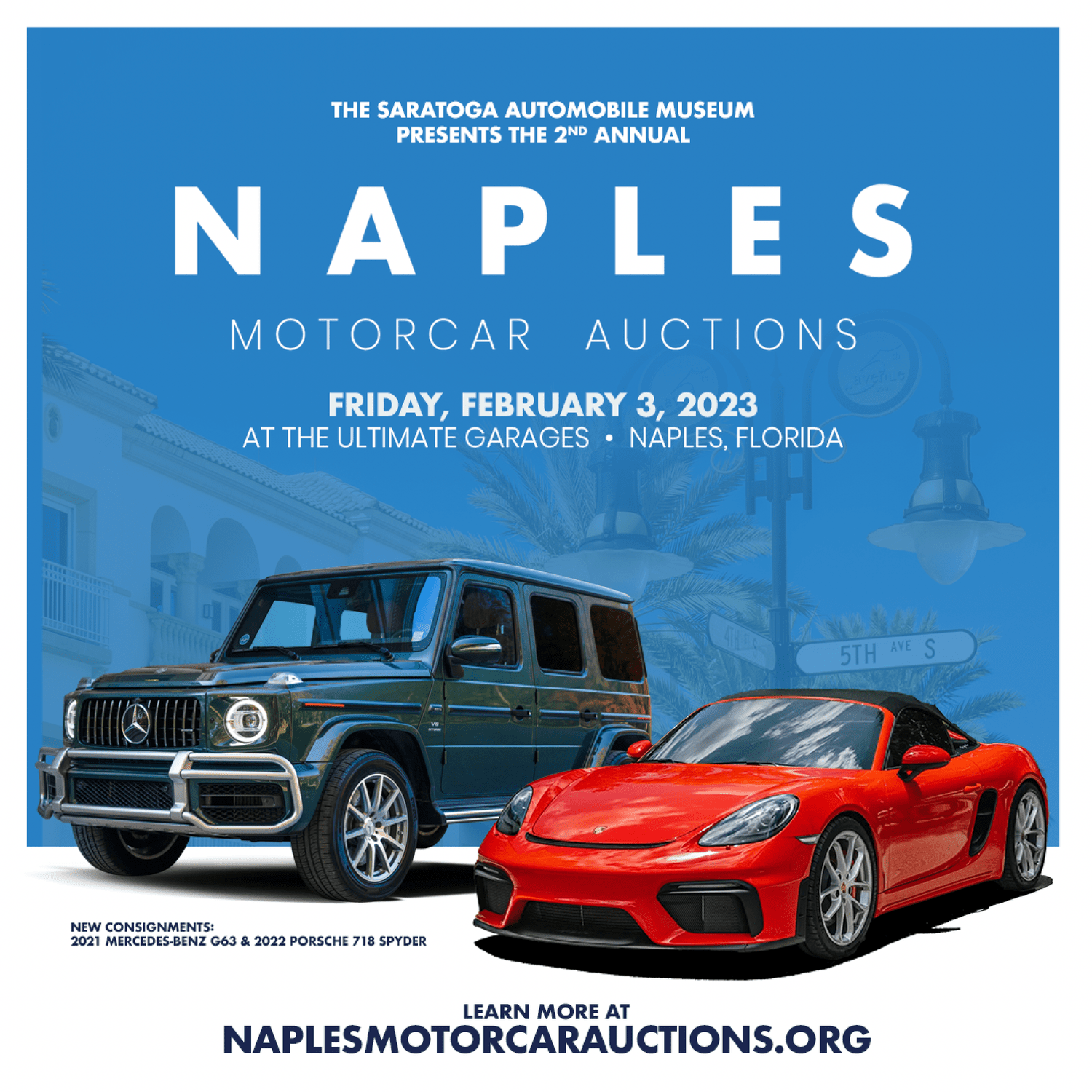 2023 Naples Motorcar Auction Friday, February 3, 2023 9:00 AM 5:00 PM Saratoga Automobile Museum 110 Avenue of the Pines Saratoga Springs, NY, 12866 (map) Google Calendar ICS REGISTER HERE