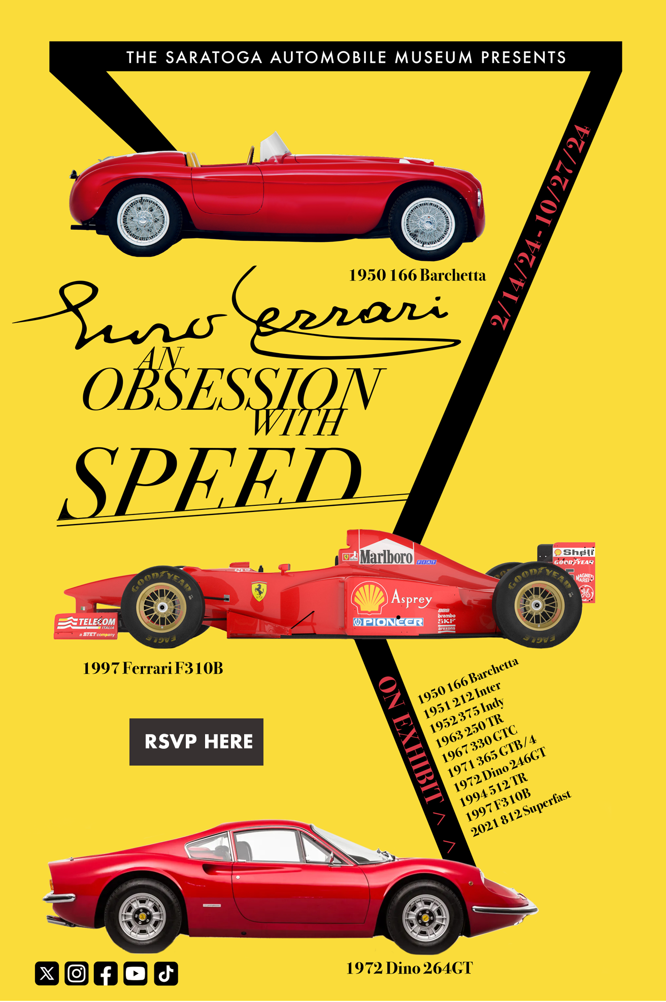 Embark on a journey through the relentless pursuit of speed with the Saratoga Automobile Museum's newest exhibit, "Enzo Ferrari: An Obsession with Speed." Join us for an exclusive opening night on [Event Date] from 5-7 PM, where passion for performance takes center stage. Savor light hors d'oeuvres and along with a cash bar, setting the tone for an evening immersed in automotive excellence. At 6 PM, indulge in a guided tour, providing a deeper understanding of the legendary Enzo Ferrari's unwavering commitment to speed and innovation. Don't miss this chance to be among the first to explore this captivating exhibit, as we delve into the heart of one man's extraordinary obsession with pushing the boundaries of automotive achievement. Secure your tickets now for an unforgettable evening at the Saratoga Automobile Museum, where history, speed, and sophistication converge.