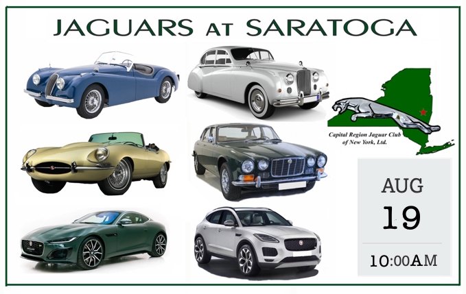 Back to All Events Jaguar Car Show Saturday, August 19, 2023 10:00 AM 2:00 PM Saratoga Automobile Museum 110 Avenue of the Pines Saratoga Springs, NY, 12866 (map) Google Calendar ICS